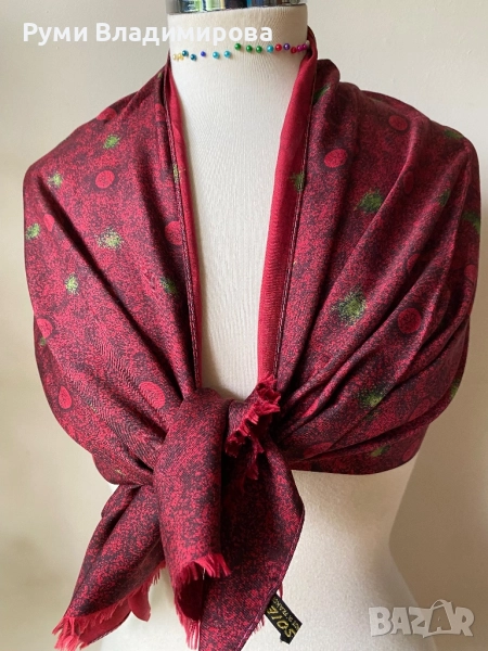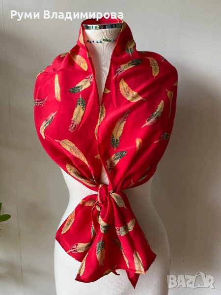 Червен шал от 100 % коприна, десен на перца, плътна коприна, размери 35 Х 158 см, нов, доставка с Еконт.