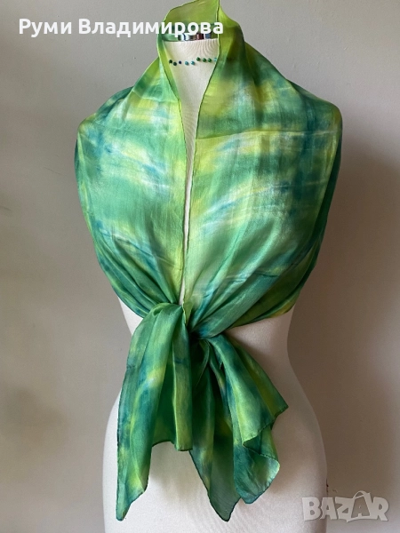 Зелен шал от 100 % коприна, акварелен ефект на цветовете върху коприната, тревисто зелено с лайм зелено до електриково зелено, тънка като хартия коприна, размери 115 Х 42 см, липсват етикети, доставка с Еконт.