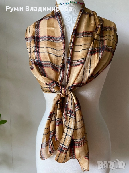 Бежов, кариран шал, каре тип Burberry, тънък, мек, шал, без етикет, вероятно изкуствена материя, размери 154 Х 38 см, нов, доставка с Еконт.