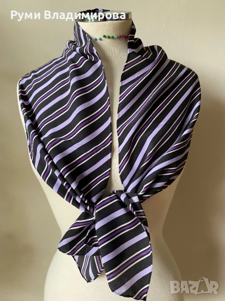 Копринен шал в черно и лилаво райе, от 100 % коприна, нов, размер 128 Х 20 см. Доставка с Еконт.