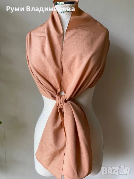 Светло оранжево/ розов шал, лека и ефирна материя, липсват етикети за марка и състав, размери - 190 Х 34 см, изключителен цвят, който може да се определи още и като цвят пудра. Доставка с Еконт.