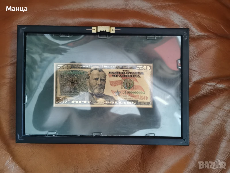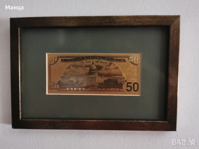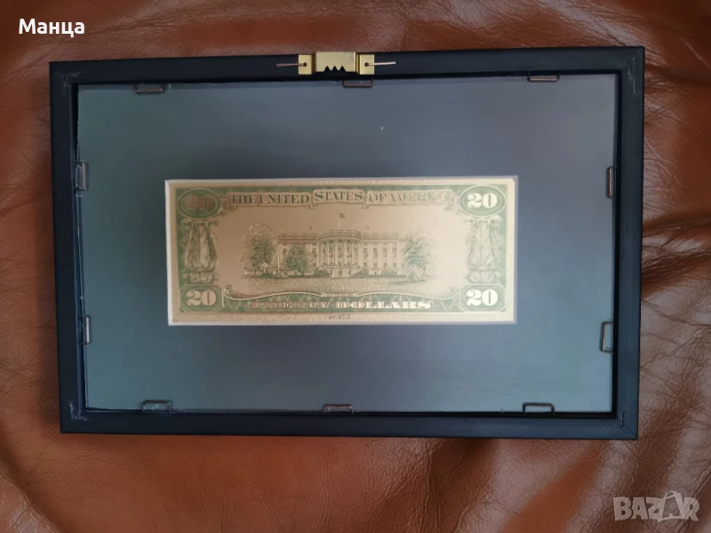 Банкноти от 20 и 50 Америкаски долара, направени от 24 каратово златно фолио. Рамкирани. Видими и от двете страни.