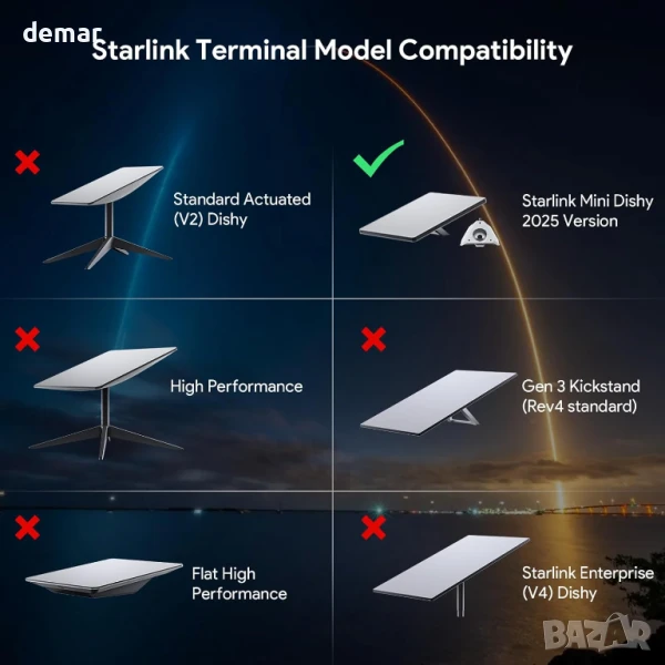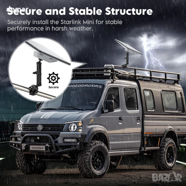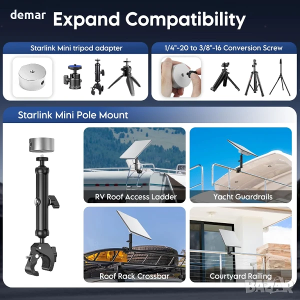 Starlink Mini 2025 позволява бързо и безинструментно закрепване към стандартни стативи 1/4"-20 и широка гама от монтажи, с двоен сферичен шарнирен дизайн за гъвкаво регулиране на ъгъла и оптимално позициониране на сигнала. Съвместим с различни аксесоари чрез включен винт за преобразуване, той е подходящ за стълбове от 1,5 до 4 см и работи в различни условия, включително кемпери, балкони, яхти и багажници на покрива, предлагайки както вътрешна, така и външна гъвкавост за пътуване и фиксирани инсталации.