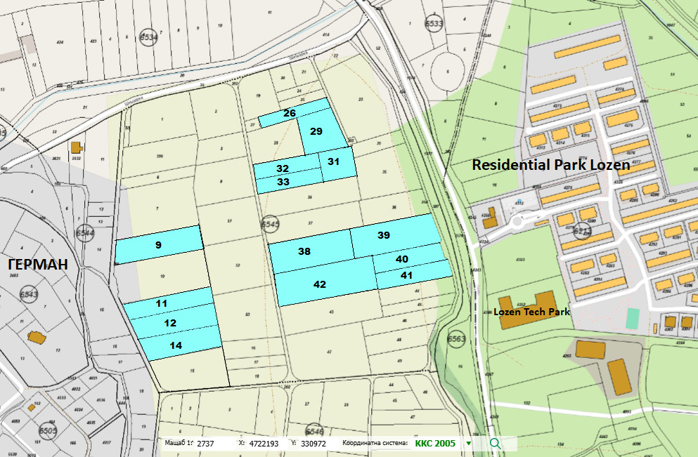 Предлагаме за продажба имот в с. Герман с идентификатор 14831.6545.9. Имота се намира в местност Бачовица . Предлагаме още 11 парцела в най-динамично развиващата се част на столицата с. Герман. Парцелите се намират се в покрайнините на селото на спокойно място с много зеленина, в близост до Lozen Residential Park, с бърз достъп от Околовръстен път по ново изградена отсечка до Порше изток. От парцелите се разкрива невероятна панорама към София, Витоша и Стара Планина. Регулационната зона в която попадат имотите е Жвд жилищно-вилна зона за далеко перспективно развитие със следните параметри на застрояване: