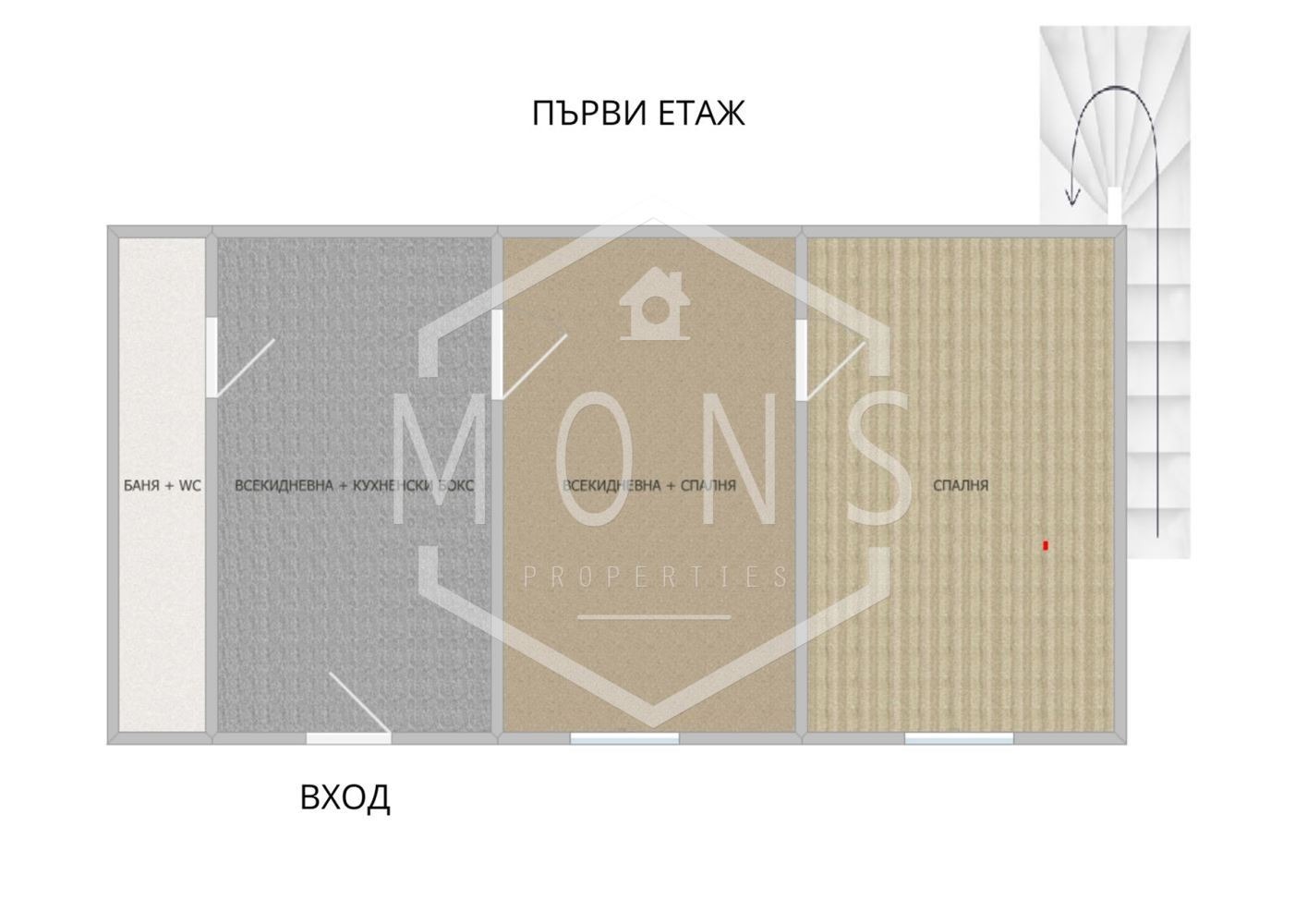 -Първи етаж: всекидневна с кухненска част, трапезария, спалня и баня с тоалетна.