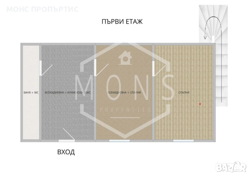 -Първи етаж: всекидневна с кухненска част, трапезария, спалня и баня с тоалетна.