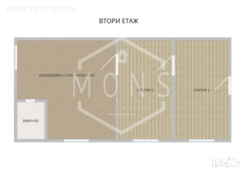 -Втори етаж: всекидневна с кухненски бокс, две спални и баня с тоалетна.