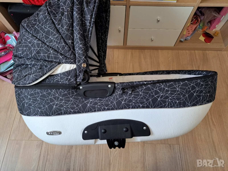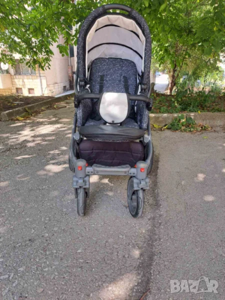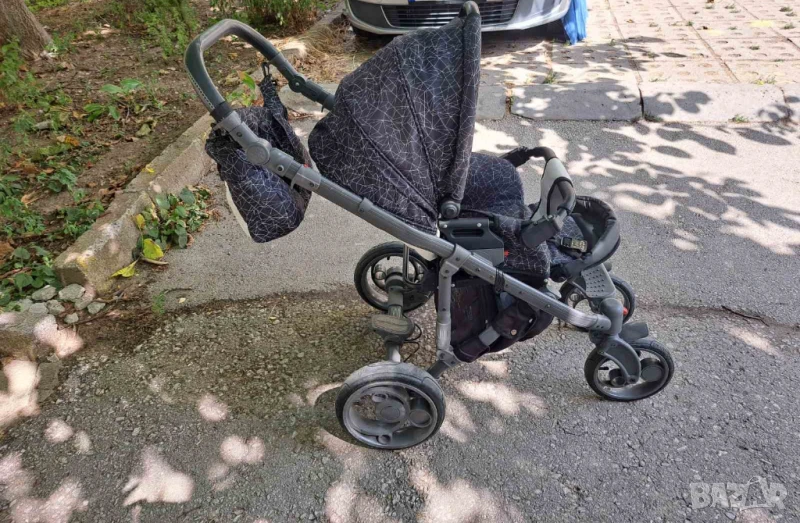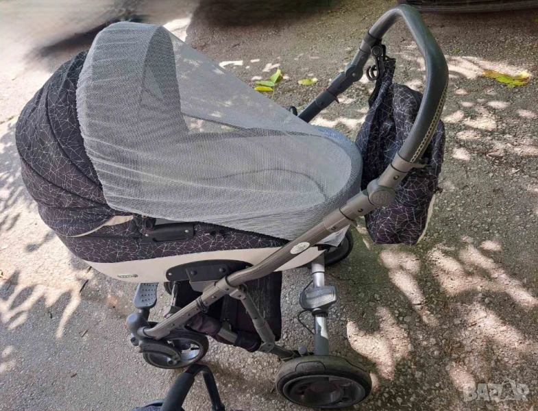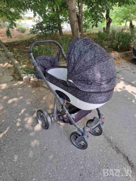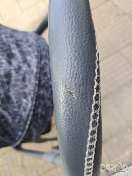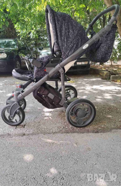 Изключително запазена и маневрена детска количка. Има две-три драскотини по шасито, които могат да бъдат коригирани с лак за нокти или спрей.
