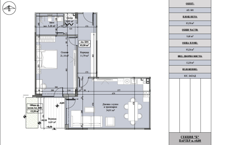 Жилището разполага с: дневна с кухня и трапезария, спалня, баня, склад и веранда.
