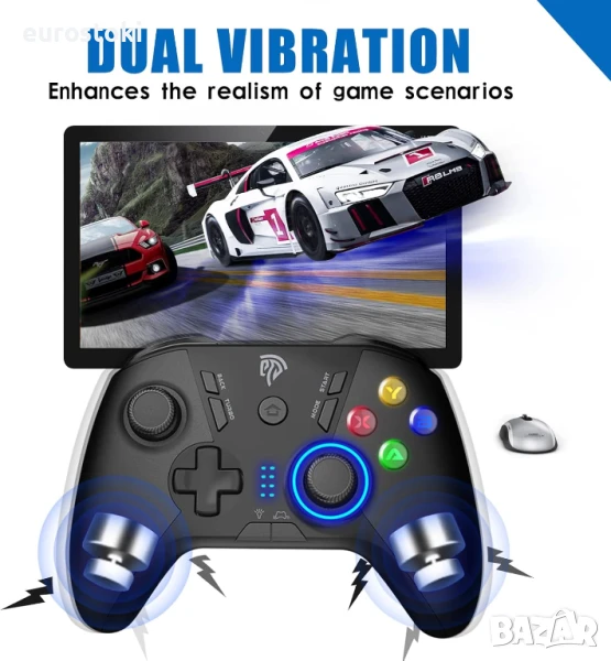 Гейминг контролерът използва 2.4G безжична технология за предаване, която се характеризира със стабилен сигнал, силна защита от смущения, голямо разстояние на свързване и елиминиране на забавянето. Дръжката е plug and play, не е необходимо допълнително устройство.