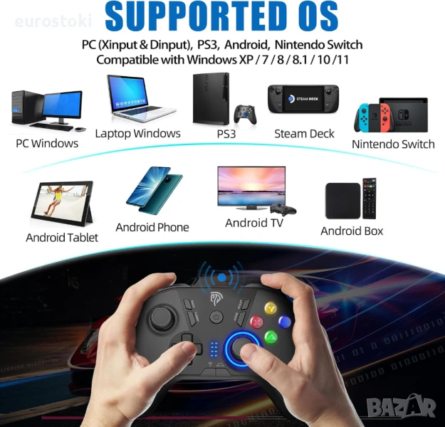 Съвместим с Windows XP/7/8/8.1/10 компютри, PS3 и Android (телефони, таблети, телевизори), които поддържат OTG и работят с Android 5.0 или по-нова версия. Работи и със смарт телевизори с Android.