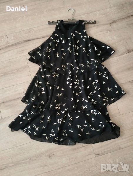 Елегантна дамска ефирна рокля , без ръкави, на пластове по дължината , която е почти до коляното, черна ефирна материя със златисти мини апликации , нова....