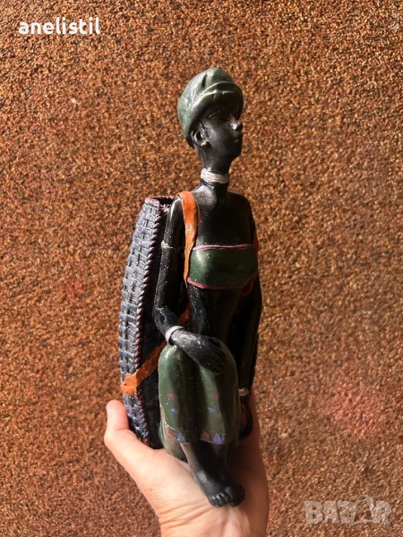 Здравейте! Продавам чисто нова, уникална декоративна ваза във формата на африканска жена, носеща кош. Вазата е висока 25 см и е изработена с внимание към детайла, представяйки елегантна и етническа визия.