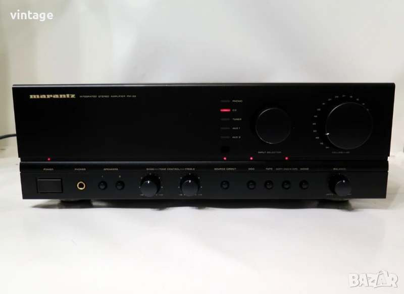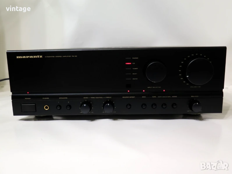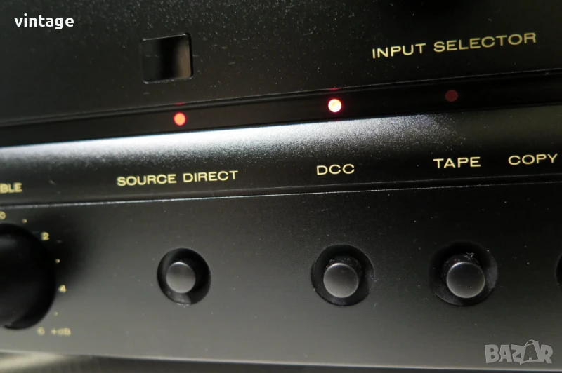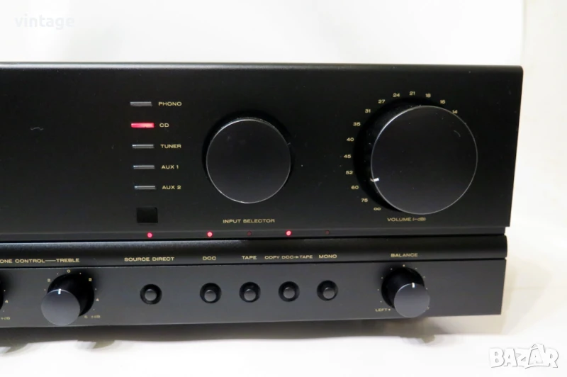 Транзисорен стерео усилвател, отличен технически, много добър външен вид. Корекции: bass (100Hz) +- 6dB, treble (10kHz) +- 6dB, source direct. Възможност за избор на ММ/МС дози. Дистанционно управление не е налично. Много добър саунд! Приложените снимки и видео са реални!