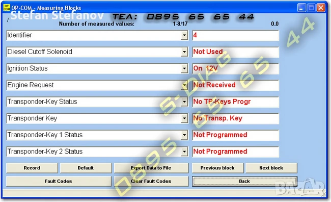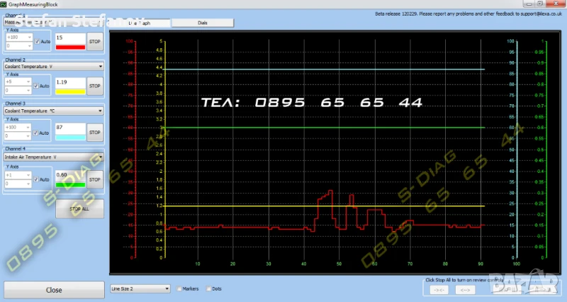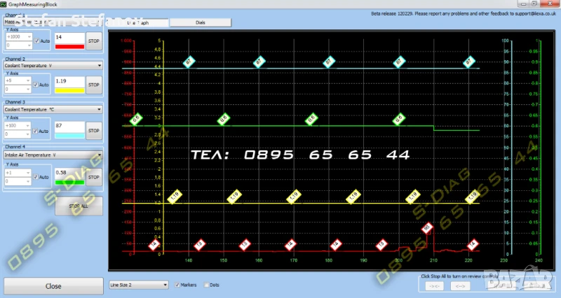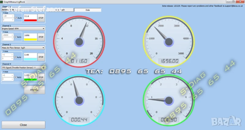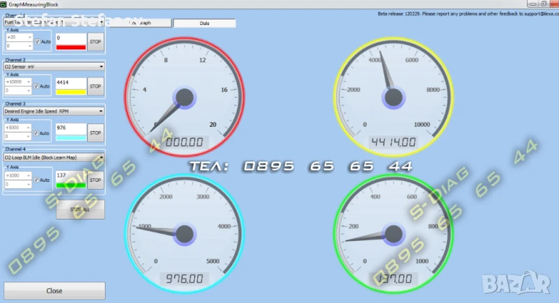 Софтуера позволява едновременно следенето на до 8 избираеми канала с живи данни, възможно е да се записват в журнал и да се експортират към други програми.