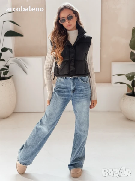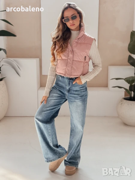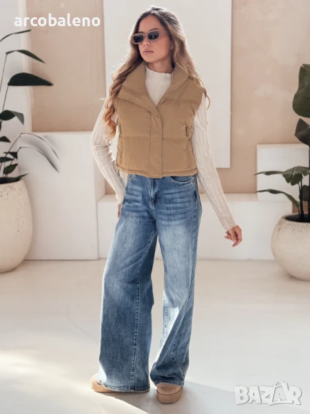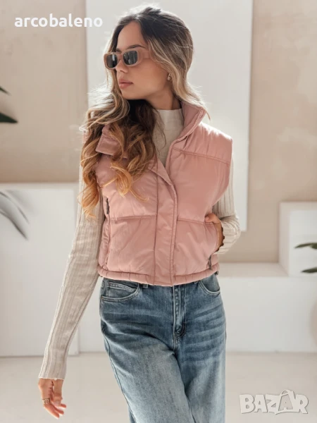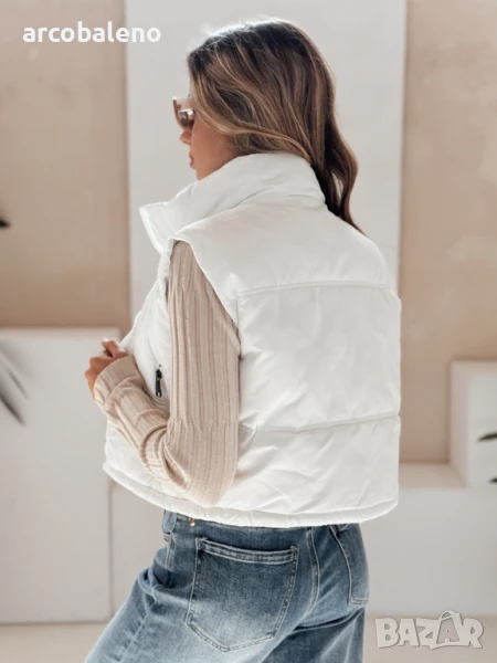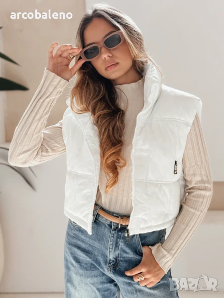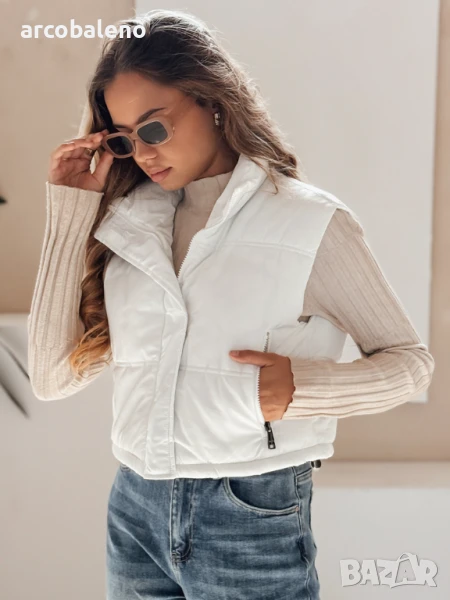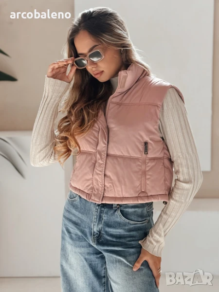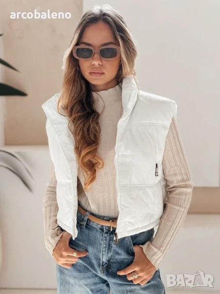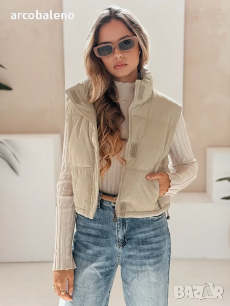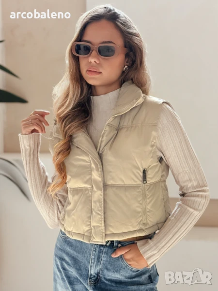 Къс, ватиран елек с висока яка е универсален основен елемент от гардероба, идеален за преходни тоалети. Минималистичният му дизайн позволява множество опции за стилизиране, а практичните детайли повишават комфорта.