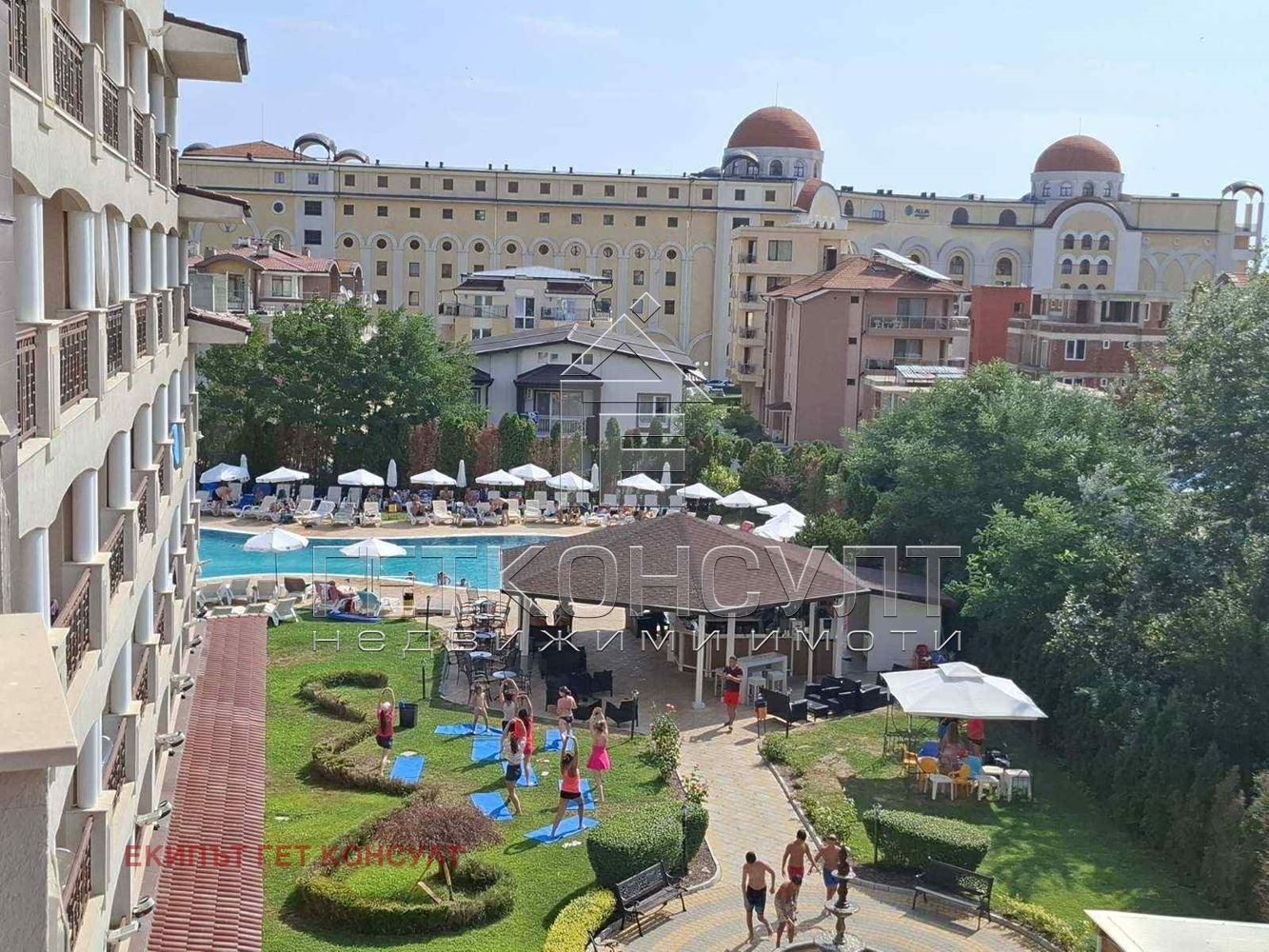 Обзор, само на няколко метра от пясъчния плаж и близо до устието на река Двойница. Заобиколен от зеленина и с прекрасна гледка към морето и планината, Средиземноморска архитектура и добре поддържана градина. Сградата е централно климатизирана, с лоби бар, бизнес център с две конферентни зали и презентационна техника, ресторант с градина 180 места, охраняем паркинг, басейни, фитнес, рецепция, целогодишна охрана, асансьор, видео наблюдение. Жилището е с обща квадратура от 70.60 кв.м, разпределени в дневна, спалня, два санитарни възела, обща за двете стаи тераса. Гледка към града и планината. Партиди ток битов) и вода (собствен водомер). Такса поддръжка е в размер на 675 EUR/година г. Комплексът предлага управление на имотите, чрез отдаването им под наем на туристи за летния туристически сезон, за времето, в което собствениците не ползват имотите си