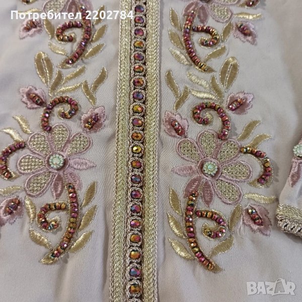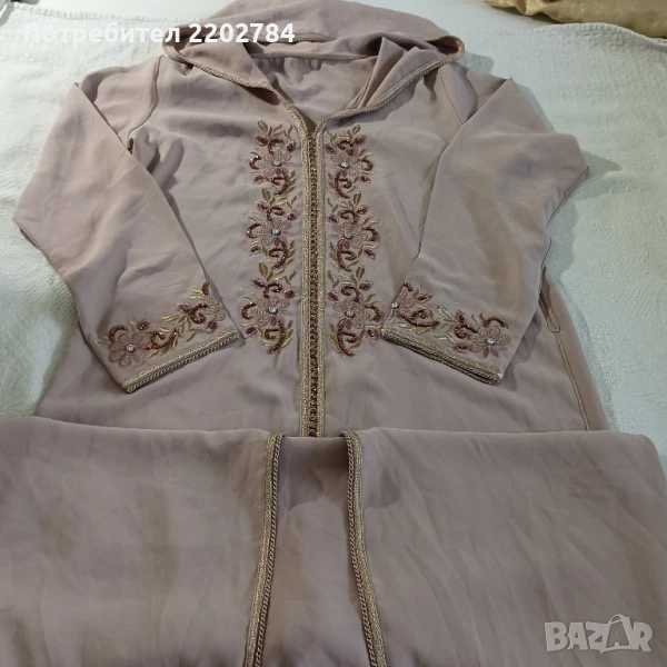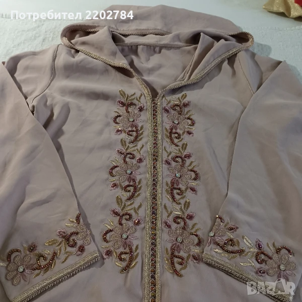 Първата е в цвят пепел от рози.Много плътна и тежка коприна,с прекрасни бродерии и блещукащи камъни.Отстрани има цепки за джобове,без джобове.С качулка.Изключително елегантна.