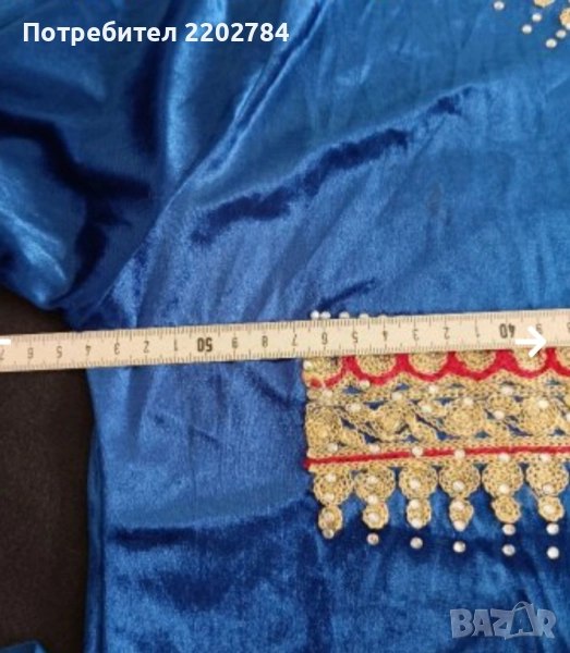 Четвъртата е от тънък син плюш с невероятно красиви бродирани ширити.Красиво деколте и предница.С малки коланчета за връзване отзад Става и за М и за Л,зависи колко свободна искате да е.