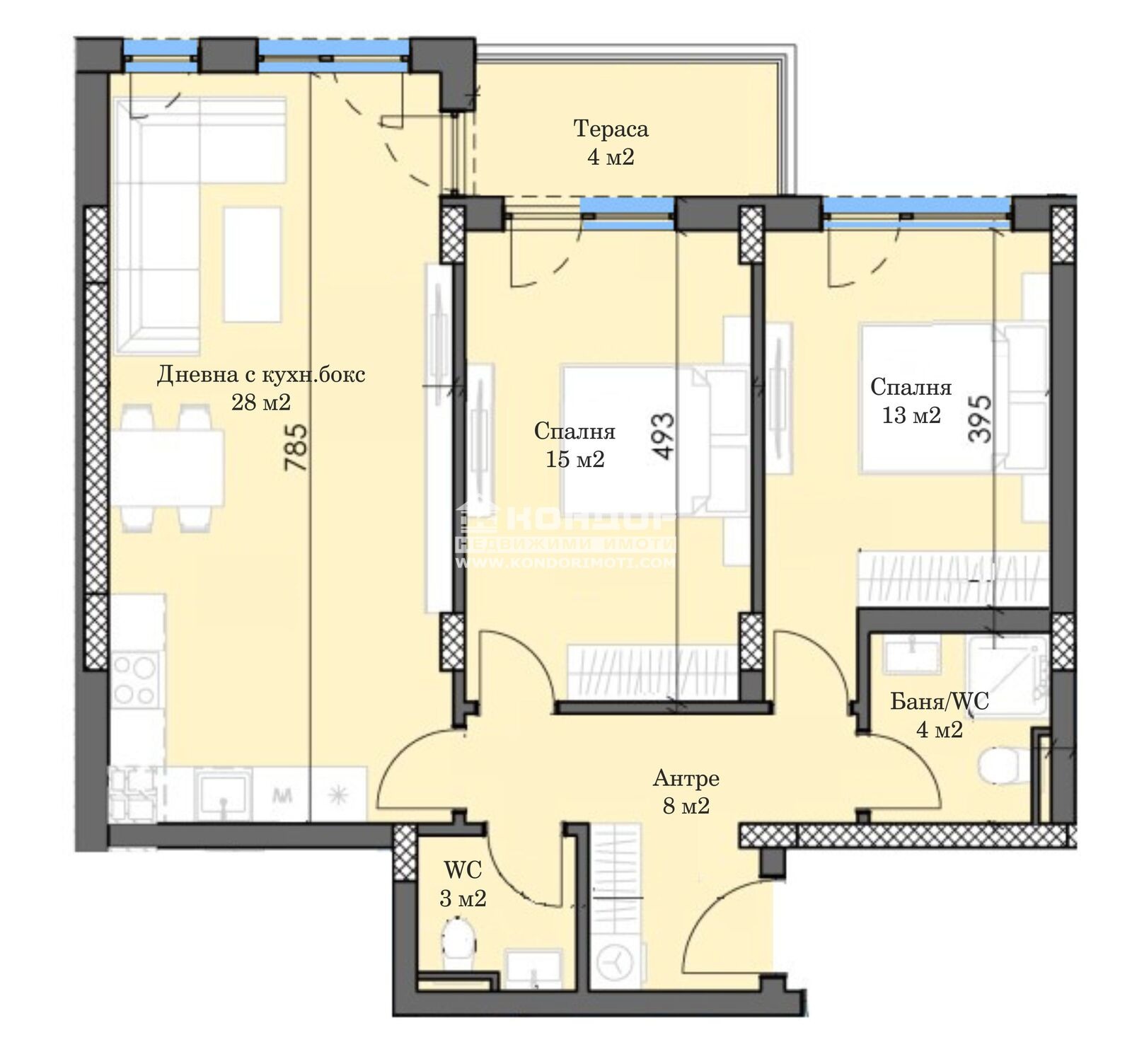 Оферта 65922: Предлагаме Ви възможността да закупите тристаен апартамент в новоизграждащ се луксозен жилищен комплекс с модерна визия, проектиран да създаде максимален комфорт на живущите в него. Функционално разположени жилищни секции с елегантен силует готов да предложи комфорт и модерен начин на живот. Едно от основните му предимства е страхотната локация, отлична комуникативност и динамична пътна инфраструктура, която осигурява бърз и лесен достъп до комплекса от всяка точка на града. Той съчетава лукс, спокойствие и комфорт с подсигурени паркоместа и гаражи. Жилището се състои от дневна /28 кв.м./ с кухненска част и трапезария, две самостоятелни спални 13 и 15 кв.м., баня с тоалетна, втора тоалетна, входно антре с място за перално и една тераса. Към апартамента има избено помещение, включено в цената! Основната концепция при проектирането е да се постигнат просторни и функционални стаи, с цел да се създаде максимален уют на модерното семейство. Изключителна съвременна архитектура и модерна технология на строителство. Визията е иновативна, привличаща внимание с уникалността си. Всяко жилище ще разполага с пълно окабеляване за домофон, интернет и кабелна телевизия, общите части са луксозно завършени, жилищата са с алуминиева дограма с троен стъклопакет от най-висок клас, масивна блиндирана входна врата. За удобство на живущите съществува възможността да закупят подземни паркоместа и гаражи с топла връзка към комплекса. Гъвкави схеми на разсрочено плащане спрямо възможностите на клиента в рамките на строителството или закупуване чрез Банков Кредит, на изключително изгодни условия за клиенти на агенцията !!! ВИЖТЕ ОЩЕ ИЗГОДНИ ОФЕРТИ НА https://www.kondorimoti.com/ С ЕЖЕДНЕВНА АКТУАЛИЗАЦИЯ!