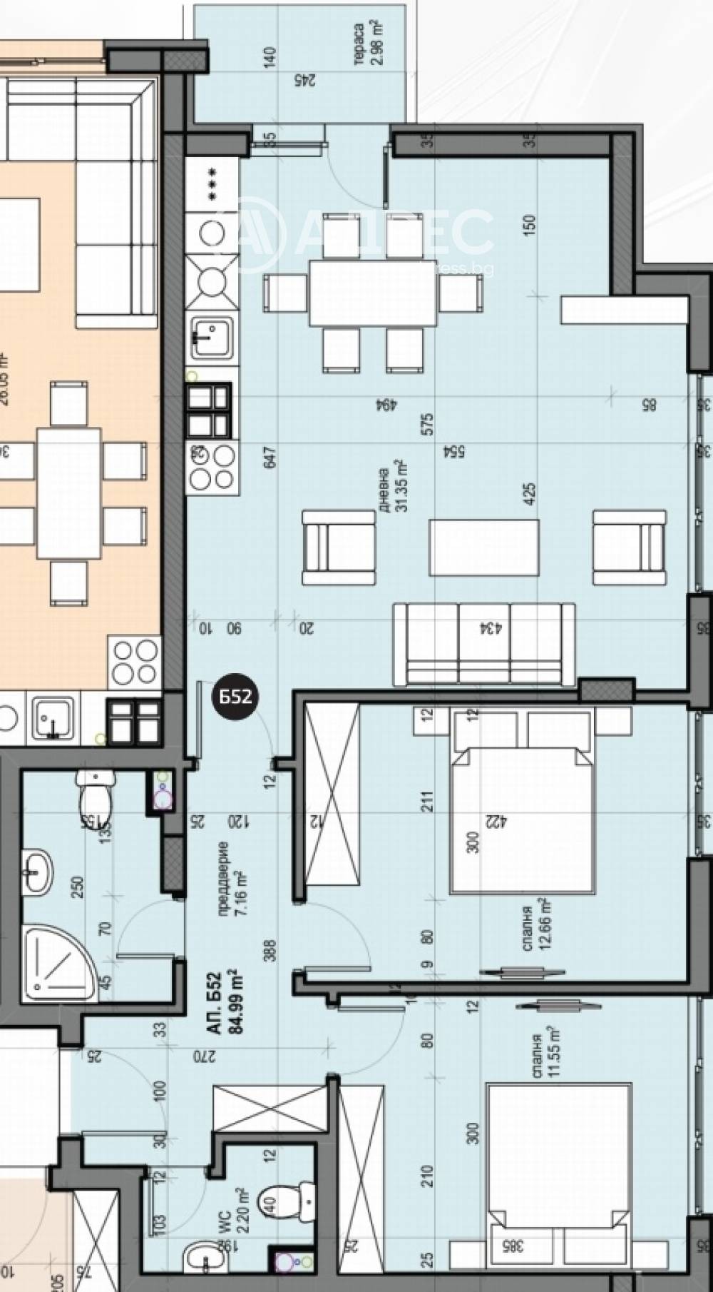 Тристаен апартамент състоящ се от дневна с кухненески бокс, баня с тоалетна и тоалетна, две спални и тераса.