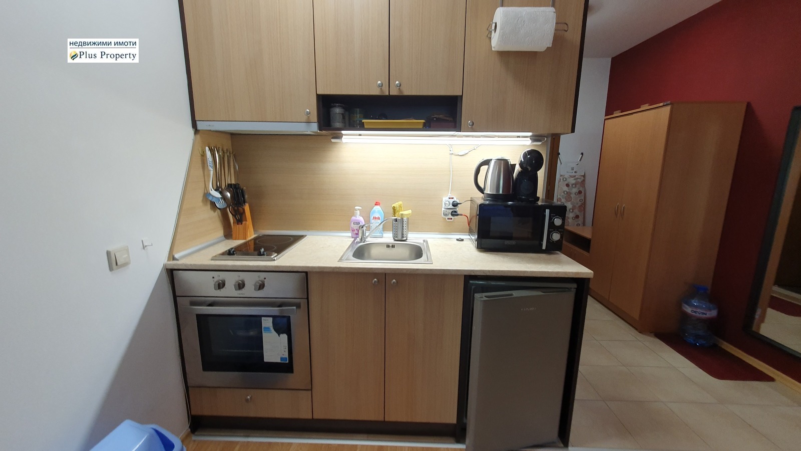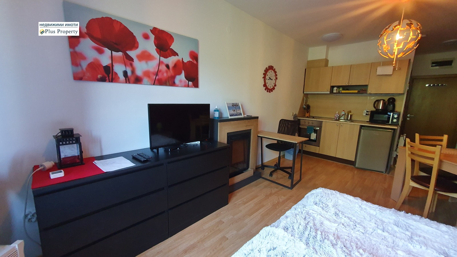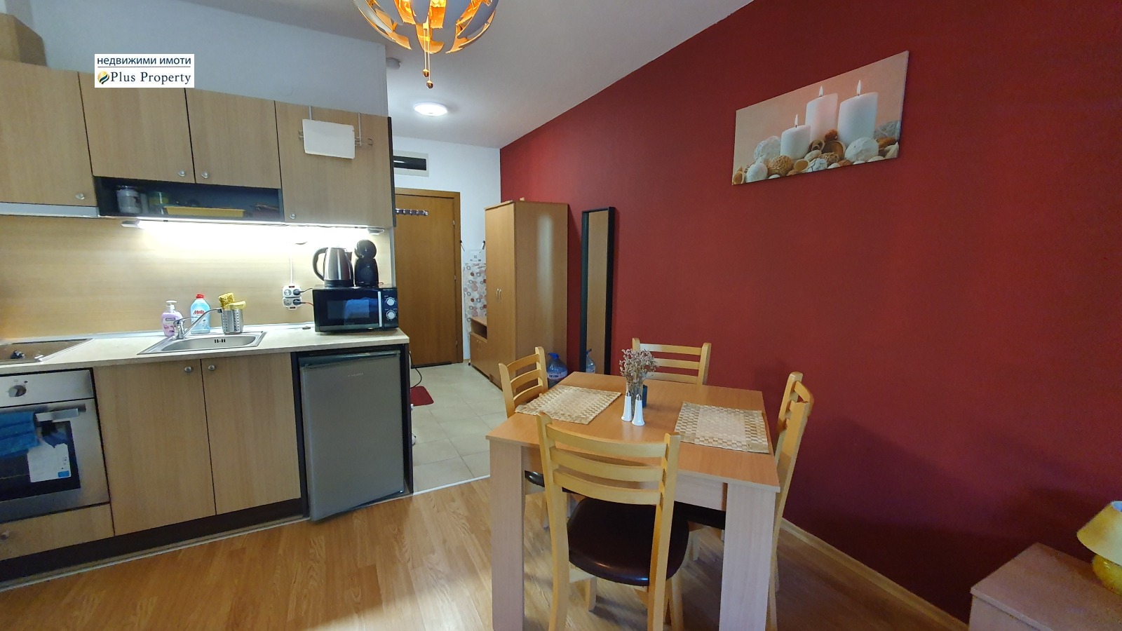 Имотът се състои от входно антре с гардероб, хол/спалня с кухненски бокс, оборудван с фурна, керамичен котлон, аспиратор и хладилник, маса за хранене, двойно легло с нощни шкафчета, скринове и телевизор. Има достъп до голям балкон с красива гледка към добре поддържаната градина на комплекса. Банята е оборудвана с вана, мивка, тоалетна и бойлер.