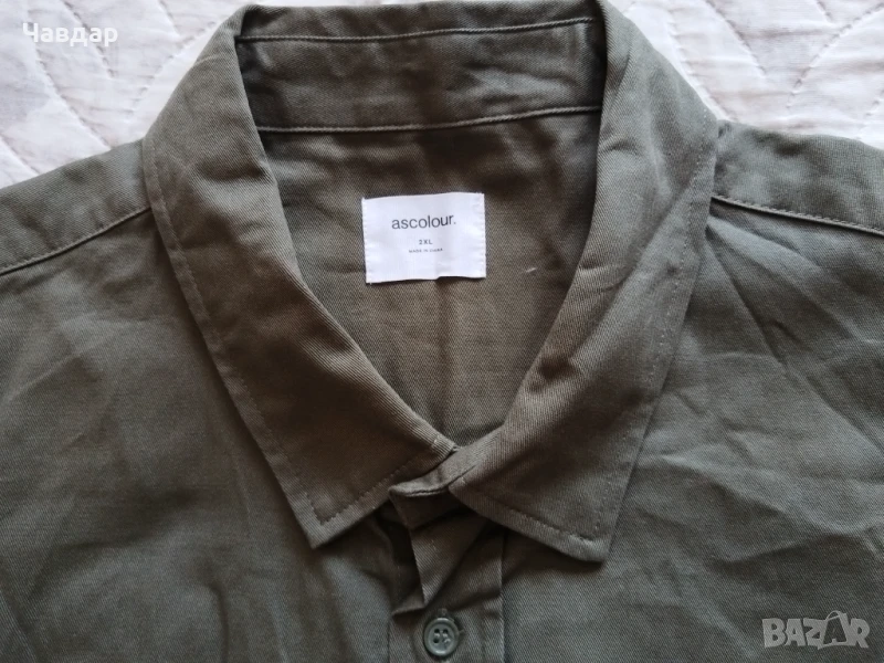 Мъжка риза (риза-яке) AS COLOR - 100% памук (изключително плътен, дебел и здрав плат подобен на брезент), цвят - тъмно зелен. Размер по етикет 2XL, но по-скоро отговаря на XL. Измерени: рамо - 52 см., височина (до яката - гръб) - 82 см., ръкав (от рамото) - 70 см., подмишници - 62 см. НОВА без етикет. Предлага се с опция преглед, но без тест (нови тениски, блузи и ризи - без тест). Цена - 15 евро.