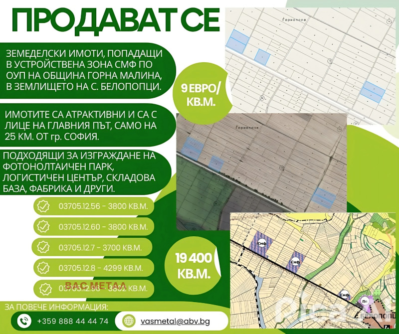 Продават се земеделски имоти попадащи в устройствена зона СМФ по ОУП на общ. Горна Малина, в землището на с. Белопопци. Имотите са атрактивни и са с лице на главния път, само на 25 км от гр. София. Подходящи за изграждането на фотонолтаичен парк, логистичен център ,складова база, фабрика и др.