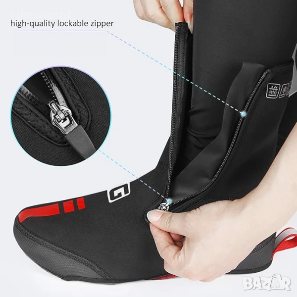 【ВЕТРОУСТОЙЧИВИ, СТУДОУСТОЙЧИВИ И ВОДОУСТОЙЧИВИ】Зимните калъфи за велосипедни обувки предпазват краката ви топли, сухи и уютни в дъждовни, снежни и ветровити дни. Термофлисовата вътрешна част е мека и топла, предпазвайки ви от нахлуване на зимен студ. 【ЗАЩИТА ЗА БЕЗОПАСНОСТ】Този калъф за велосипедни обувки е с отразяващи ленти на задните пети, които могат да подобрят видимостта при условия на слаба светлина и да ви гарантират безопасност при колоездене на тъмно. Дизайнът с обработка на ръбовете ви позволява да не се притеснявате за хлъзгави крака по време на каране. 【ЛЕСЕН МОНТАЖ И ПРЕМАХВАНЕ】Водоустойчивият дизайн с цип подобрява водоустойчивата функция, освен това е лесен за монтиране и сваляне на калъфа за велосипедни обувки.