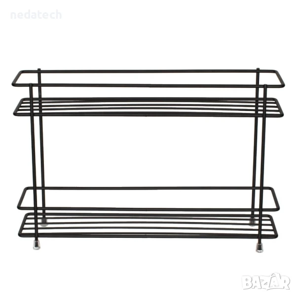 Двуетажен рафт, метален, черен. Има силиконови капаци на краката, така че да не се хлъзгат и да не повредят плота или шкафа. Удобно побира пакети с подправки или контейнери за храна, козметика и други. Рафтовете са с дълбочина 4 см. Те организират предметите, така че да можете лесно да ги намерите, и могат да бъдат поставени в кухнята, банята или всяка друга част от дома.