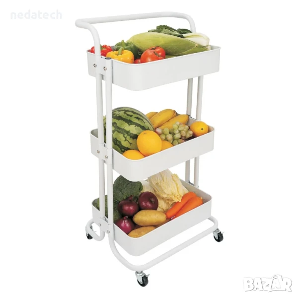 Бяла метална количка с 3 рафта, дизайн с дренаж, 4 колела за лесно движение и система за стабилизация, винтове от всяка страна на нивото за по-голяма стабилност и прибираща се дръжка. Всеки рафт е с дълбочина 8 см. Идеална е за вашата кухня или баня.