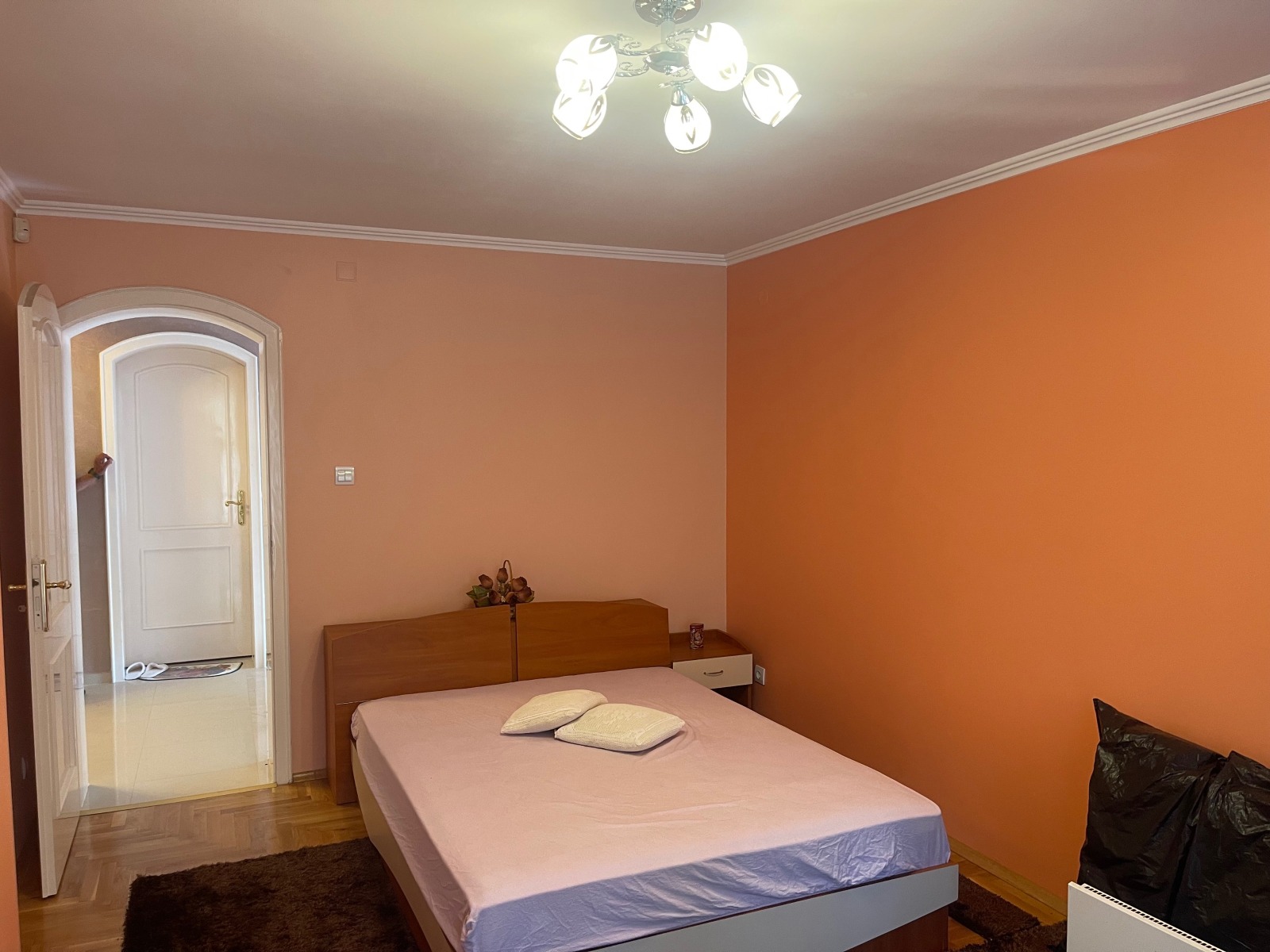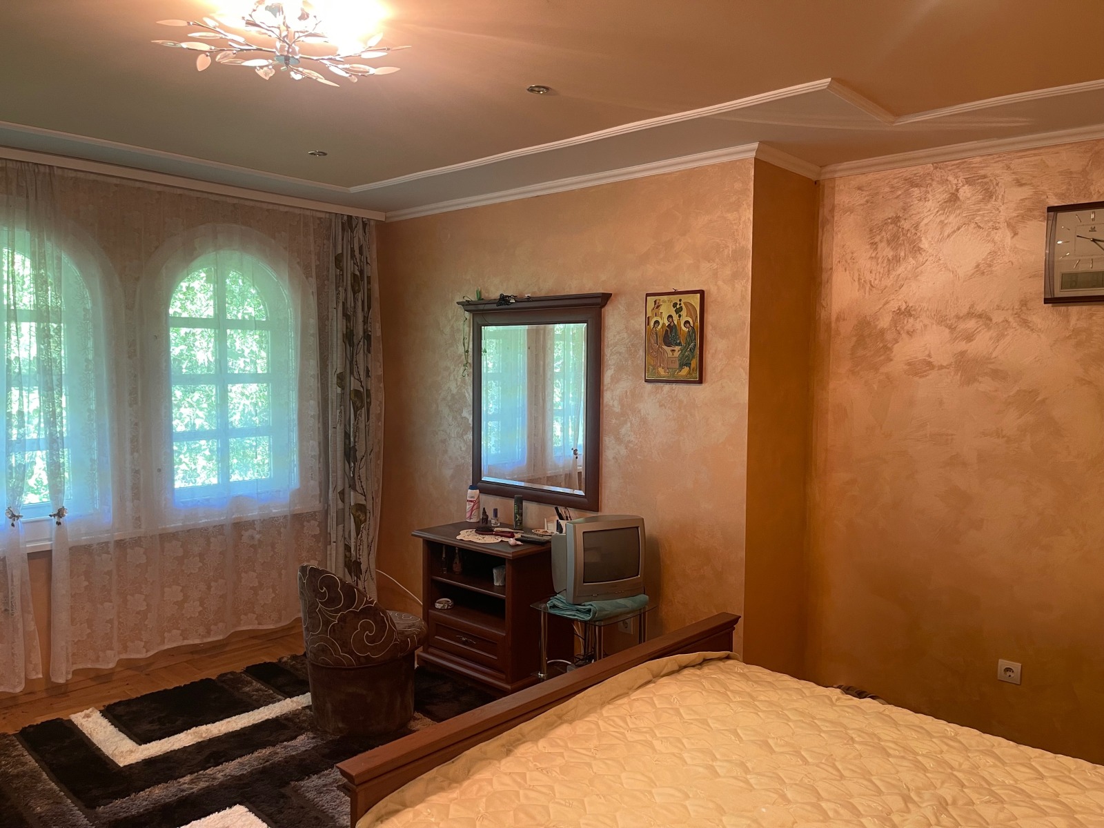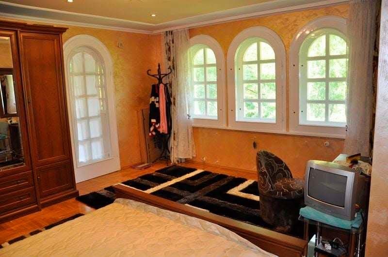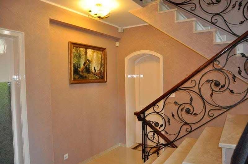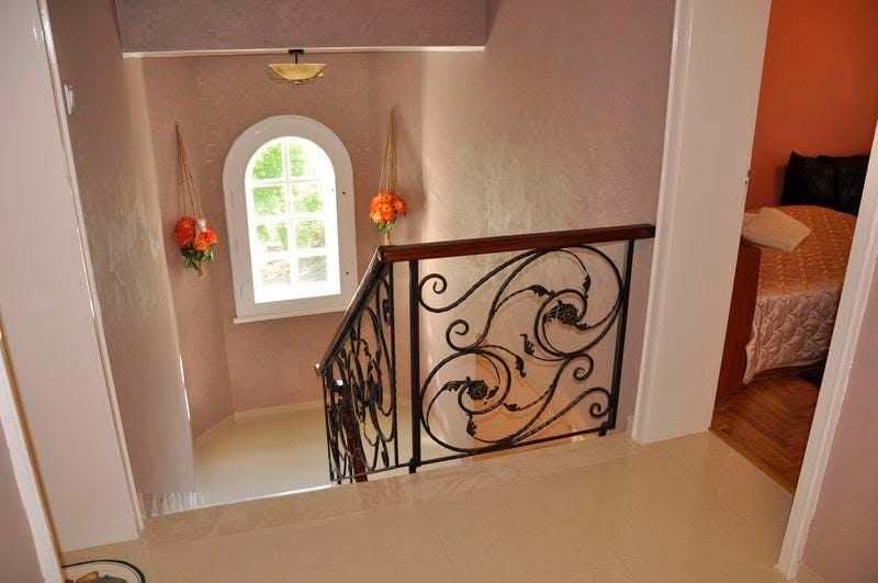 4.Втори етаж с площ от 90 м2-три обзаведени големи стаи с изходи на голяма тераса, антре, голяма и малка баня(за довършване)-завършено е на: подове-лакиран дъбов паркет и врачански камък(полиран и лакиран), стени- гипсова шпакловка и луксозни мазилки, стълбища на врачански камък(полиран и лакиран), парапети от ковано желязо и обработено масивно дърво;