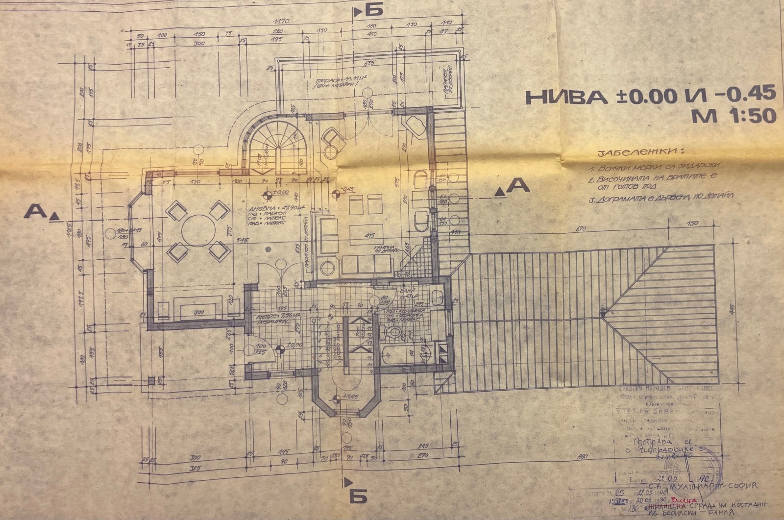 Продава се масивна триетажна жилищна сграда строена 1996 година по проект на арх. Лозан Лозанов(проектирал Резиденция Бояна и други емблематични сгради), Дворното място е с денивелация и къщата е строена на различни нива, състояща се от: 1.Сутеренен етаж с площ от 50 м2-вътрешна стълба, избено помещение, складово помещение, котелно помещение и помещение за фитнес, сауна или битово с излаз към вътрешната част на двора-завършено е на: подове-гранитогрес, стени- гипсова шпакловка, стълбище на