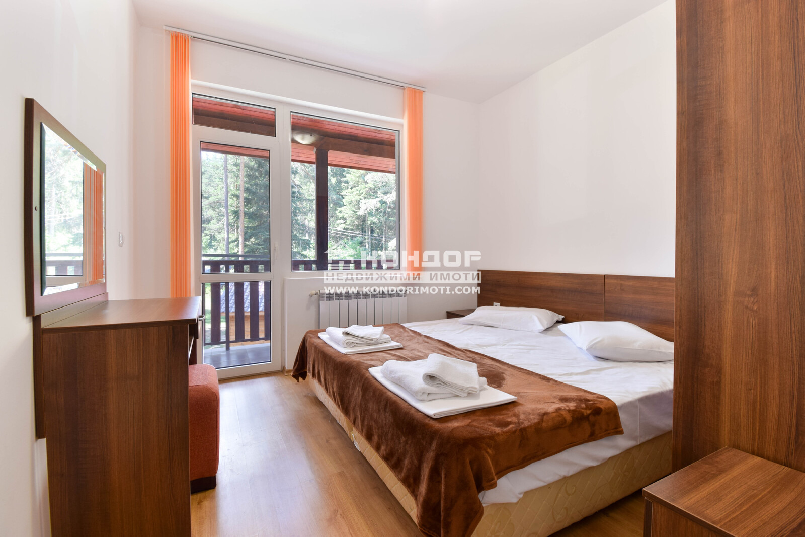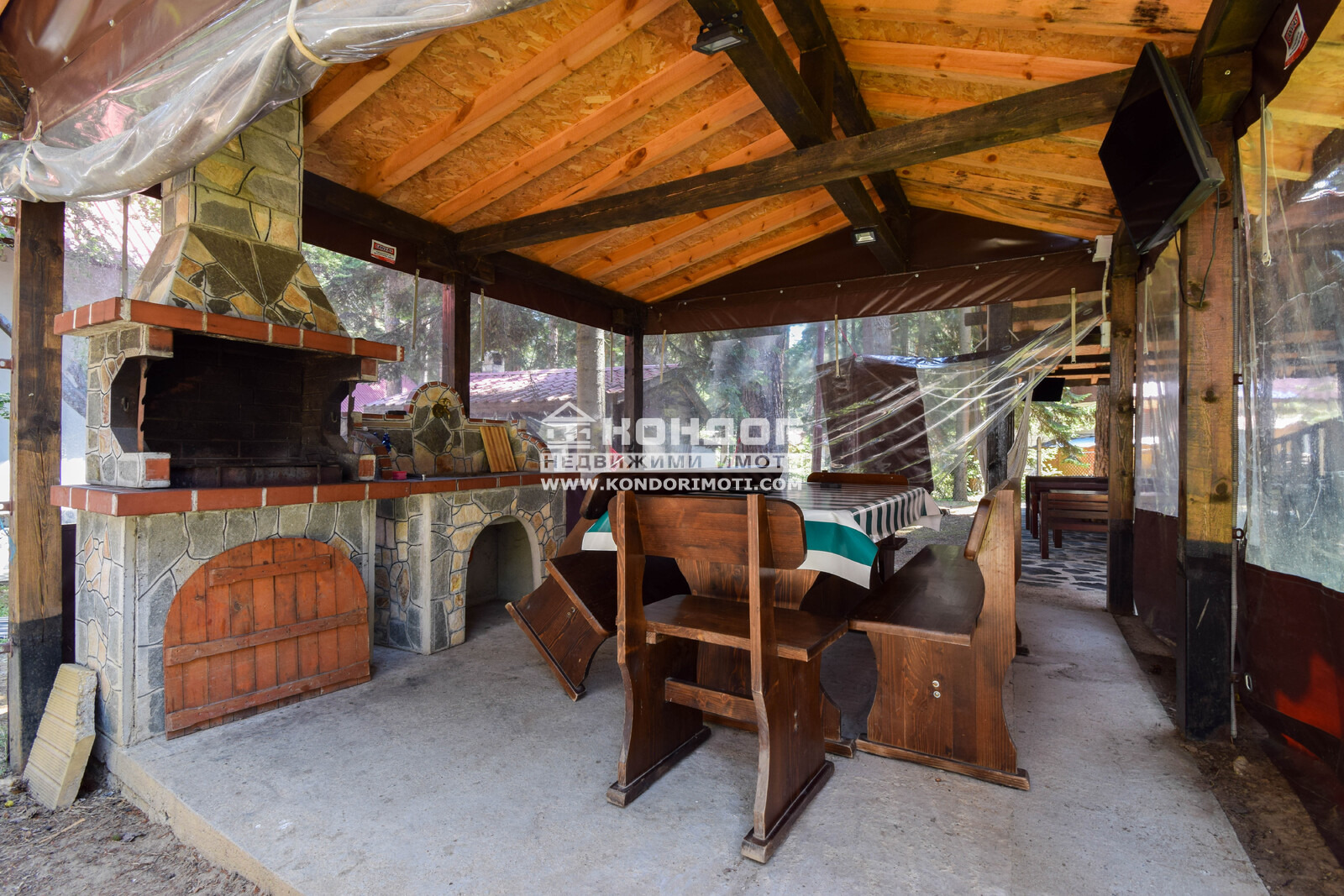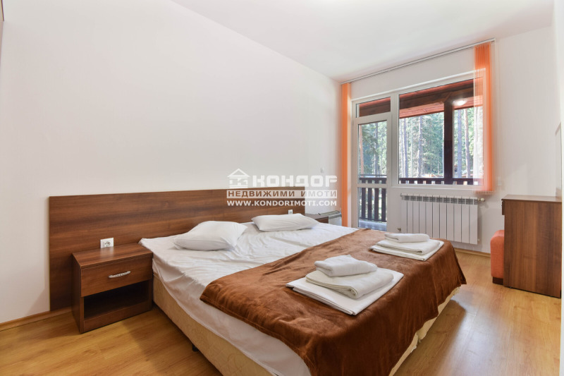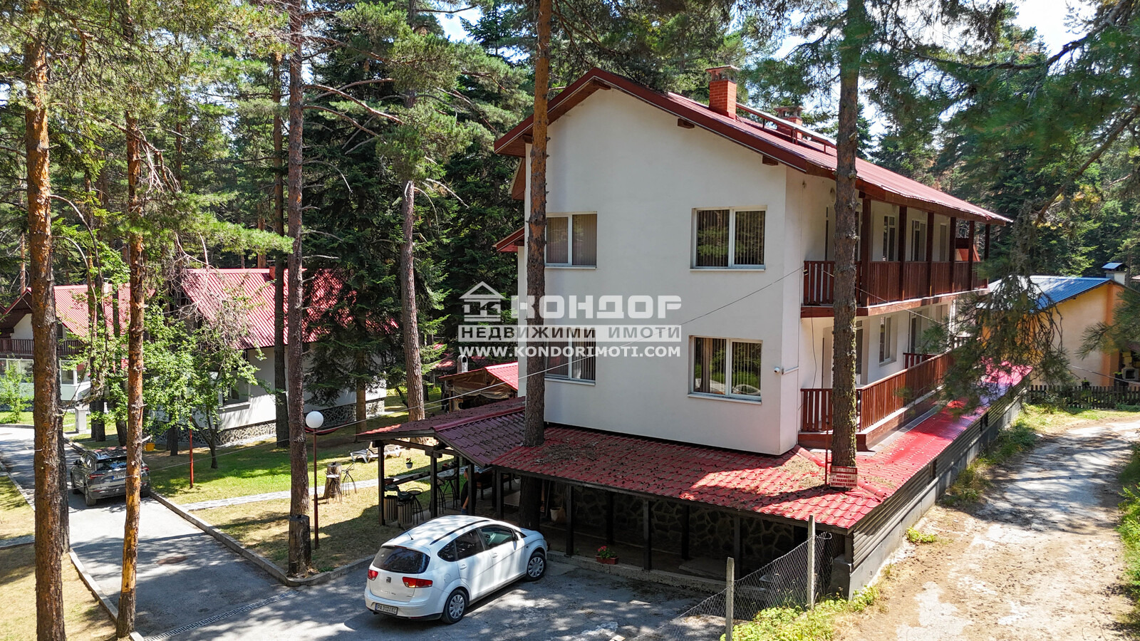 Вили: 9 двуетажни и 1 едноетажна, общо РЗП 1 161 кв.м., всяка със собствена кухня, хол с камина, две спални, веранда с изглед към борова гора и оборудване за целогодишно ползване.