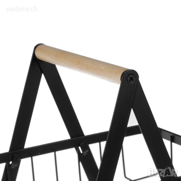 Двуетажен рафт с матово черно покритие, което не събира прах, издръжлива метална рамка и дървена дръжка. Удобно побира пакети с подправки или контейнери за храна, козметика и други. Рафтовете са с дълбочина 4,5 см. Те организират предметите за лесно намиране и могат да бъдат поставени в кухнята, банята или всяка друга част на дома. Не са необходими инструменти за сглобяване.
