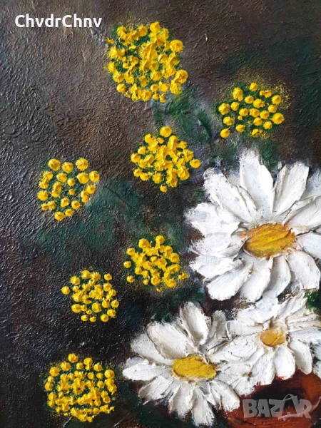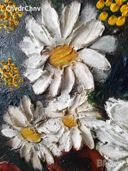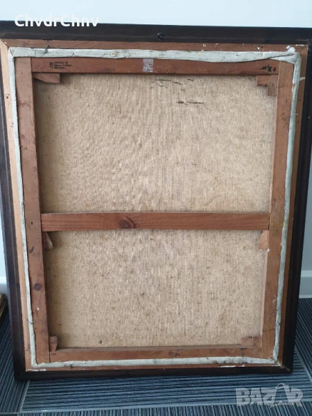 Техника масло върху платно (много дебела шпакла), дървена рамка, втора/вътрешна рамка (с паспарту), подрамка с хоризонтална стабилизираща греда и клинове в ъглите.