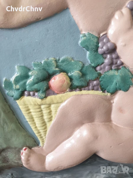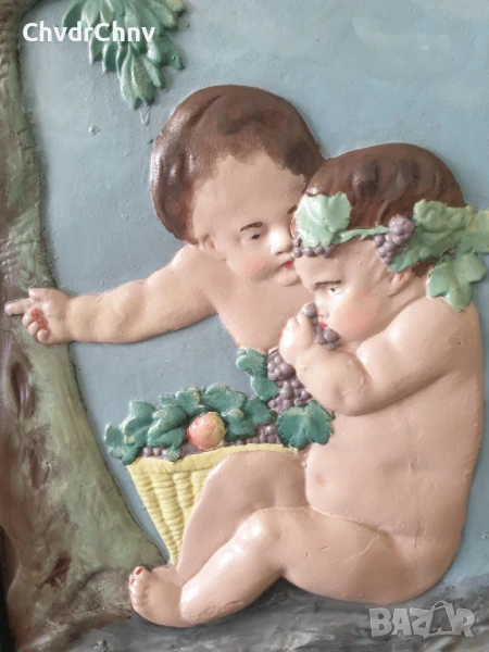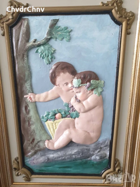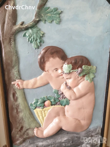 91х64см-8кг/стара голяма маслена картина-пано от гипс/голи деца/Рококо/дървена рамка