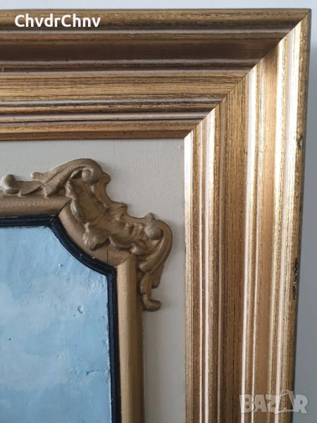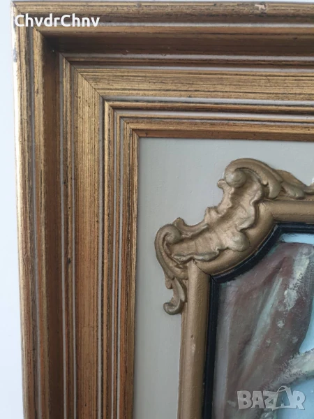 Техника масло върху релефна гипсова основа, масивна дървена рамка (ширина 7 см, дебелина 5 см), втора/вътрешна рамка (с паспарту и барокови гипсови орнаменти), дървена основа (за картината).