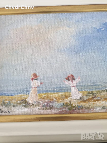 (КАРТИНА 3 / морски пейзаж, деца играят на плажа) 25х20 см, масло върху платно залепено на фазер