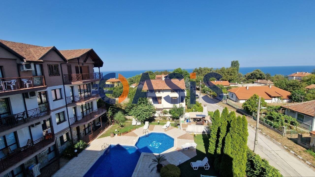Разпределение: голям коридор, баня за гости, кухненски бокс, хол с излаз на тераса, спалня със собствена баня, тераса. Апартаментът е много светъл и просторен с панорамна гледка към морето. Достъп до терасата има и от двете стаи.
