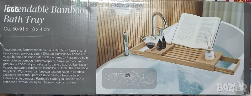 Разтегателна тава за вана за ширина 50-91 см. С поставка за чаши и подставка за книги. Изработена от бамбук.