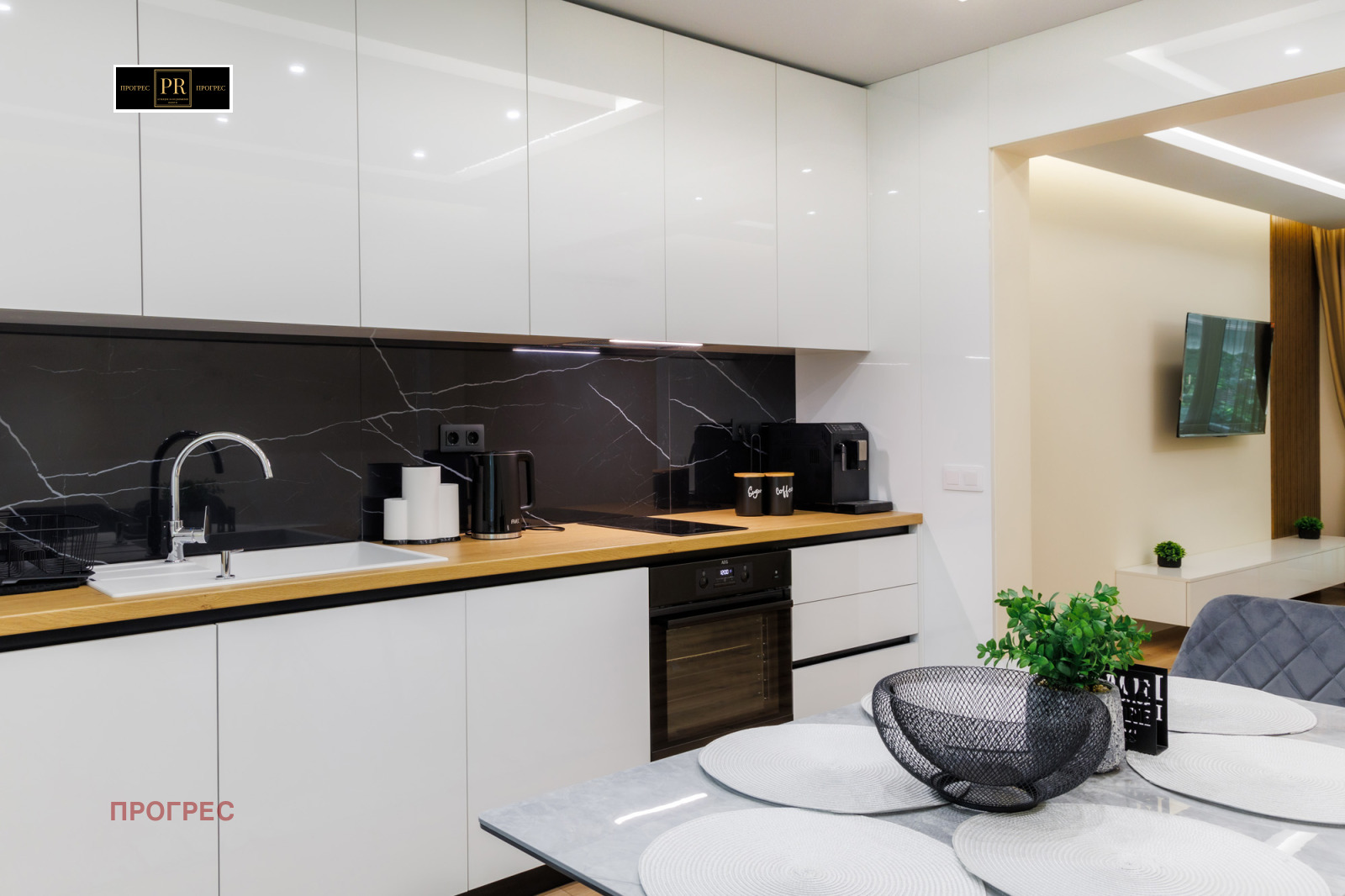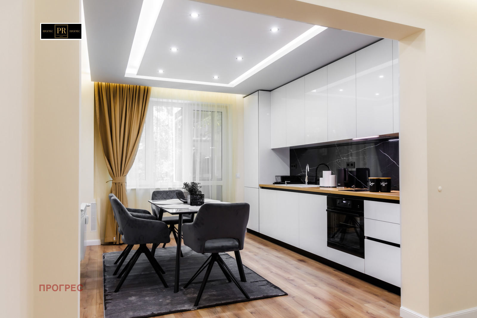 Широк хол с трапезария и кухня в отворен план - стилно обзаведени, с изчистен модерен дизайн
