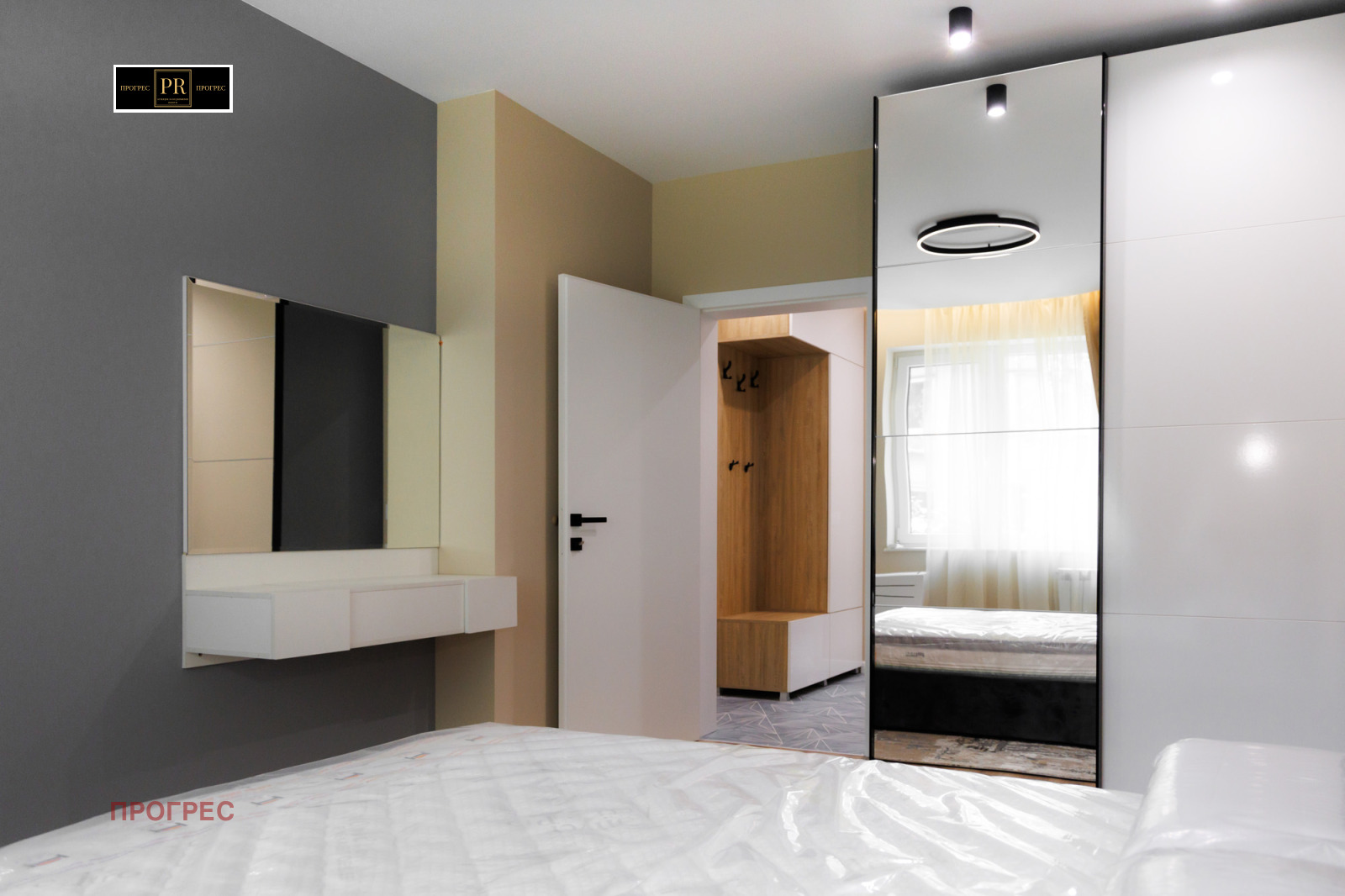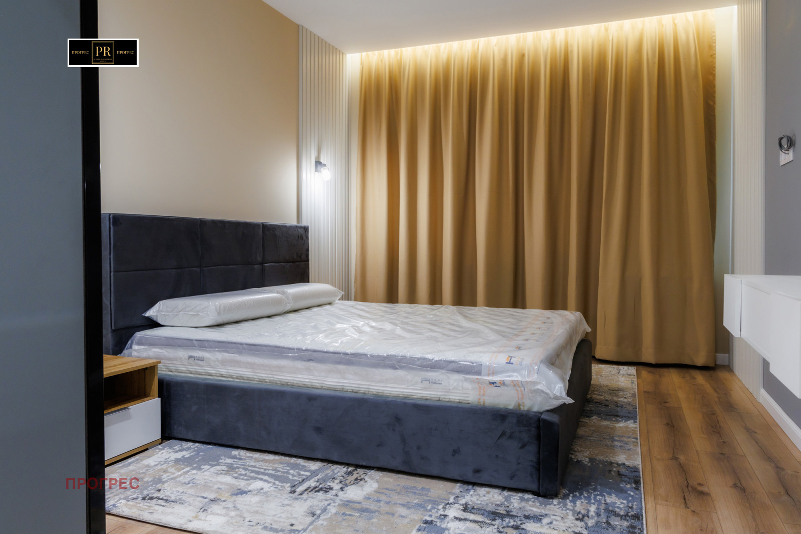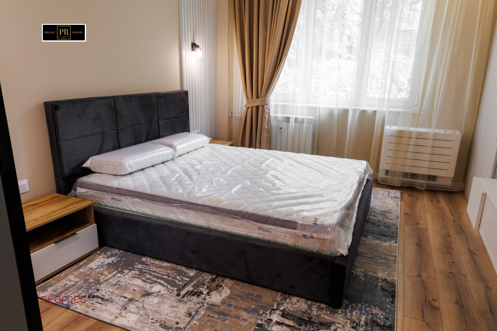 Уютна спалня с голямо легло, гардероб и нощни шкафчета