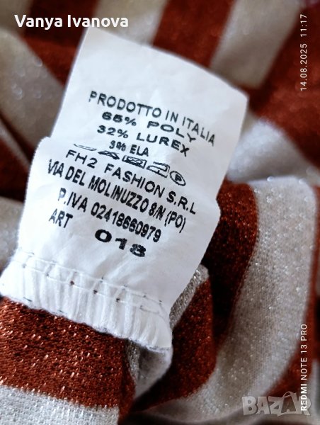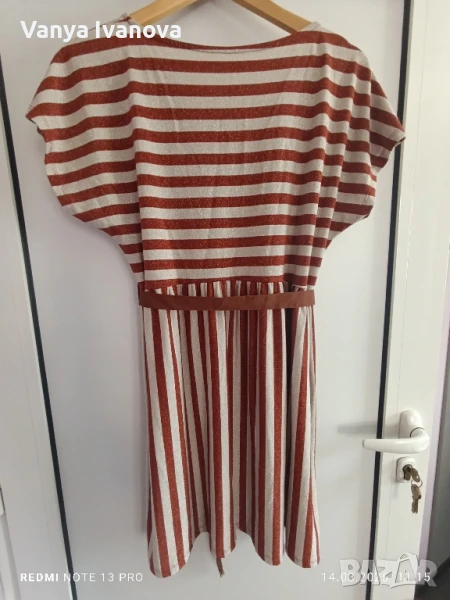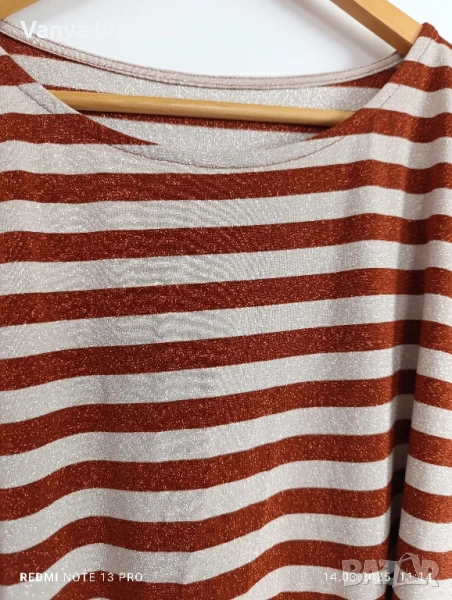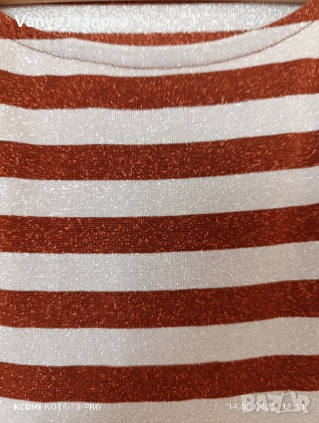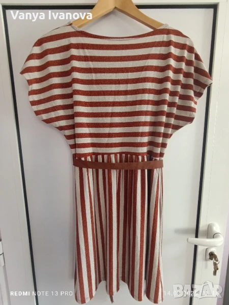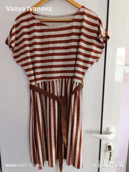 Рокля с блясък в меден цвят и бежово, не прозира , има еластичност. Размер л-хл.Има и коланче.