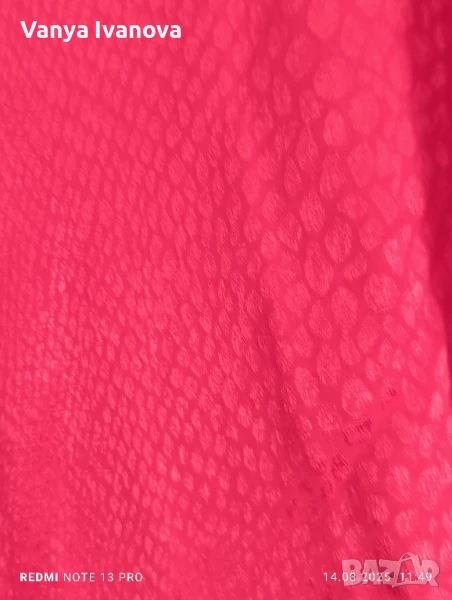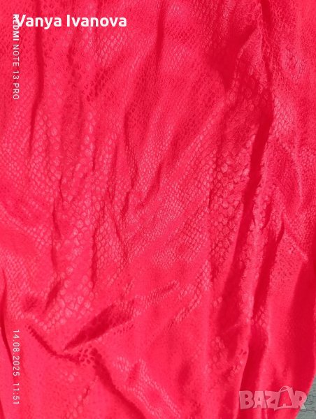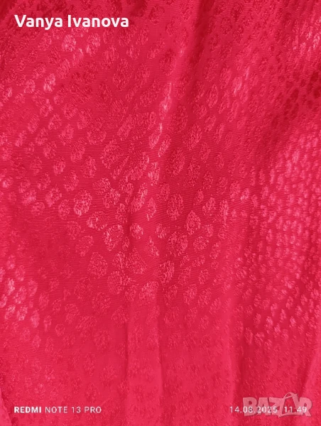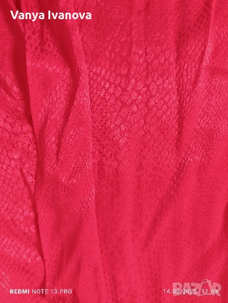 Материя вискоза, но роклята е гладка като сатен със загатнат змийски принт,цвят класическо червено и наситено