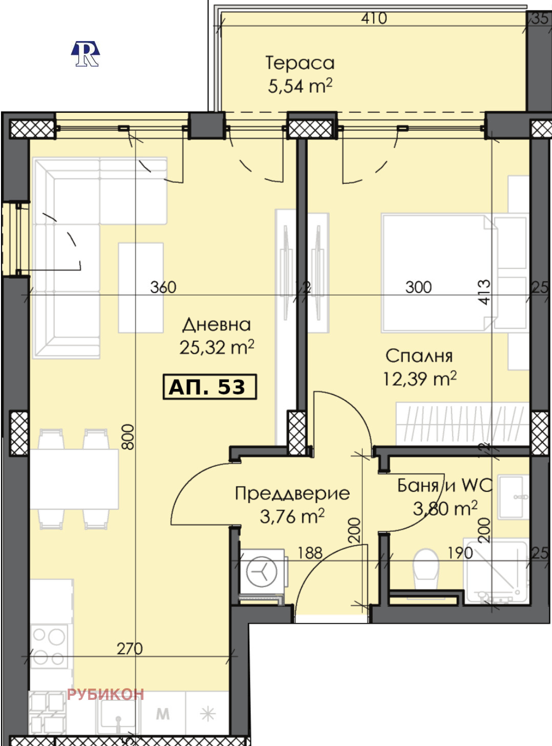 Разпределението на апартамента е както следва: просторна дневна(25.32кв.м), спалня(12.39кв.м.), преддверие (3.76кв.м.), баня с тоалетна(3.80кв.м), тераса(5.54кв.м). З Общо площ (73кв.м.).