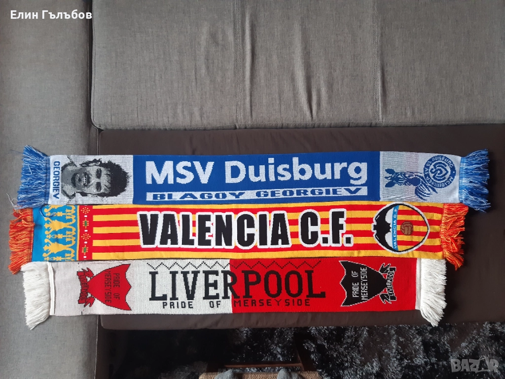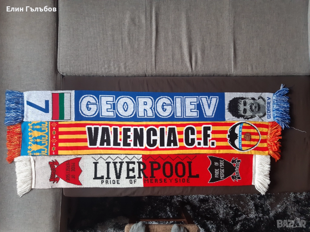 12.Шал на Валенсия.Вълнен,двойнолицев шал продукт на отбора със сертификат на самият шал.Купуван от фен шоп на отбора в Испания и донесен оттам. УНИКАЛЕН!Цената на шала на Валенсия е - 30.00 (тридесет) лв.