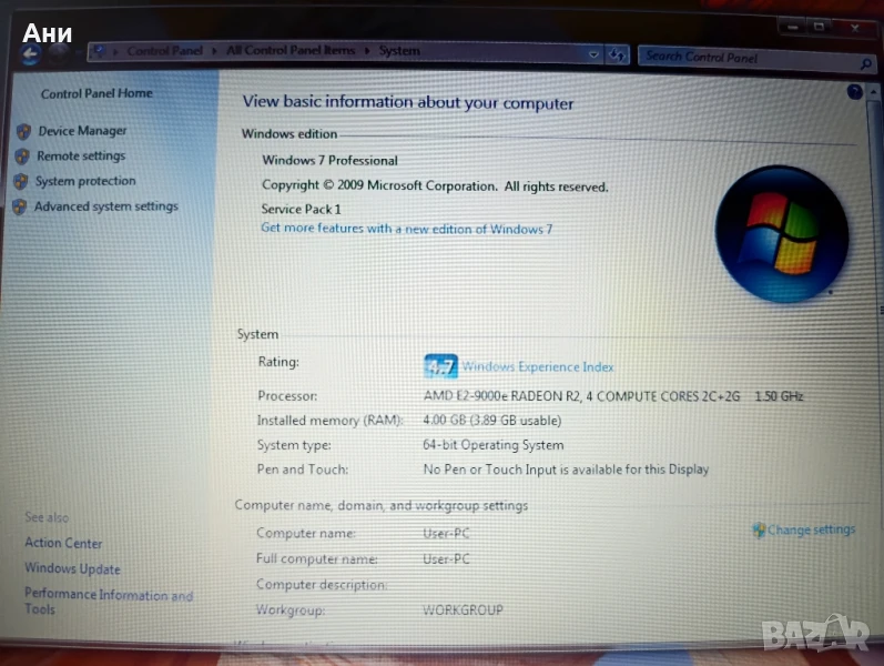 Процесор: AMD E2-9000e Radeon R2, 1.50 GHz – икономичен и надежден RAM: 4 GB