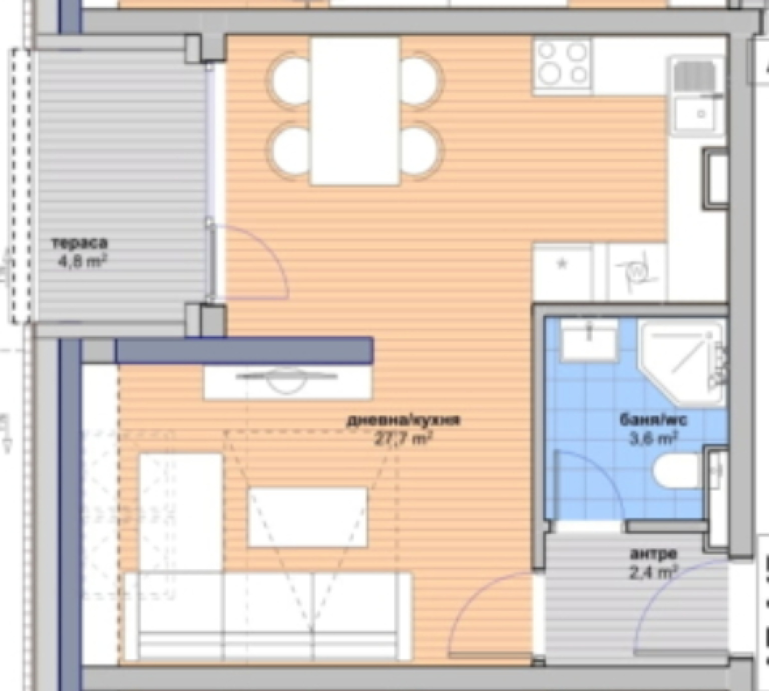 Разпределение: входно антре, всекидневна с кухненски бокс и спален кът, баня с тоалетна и тераса.