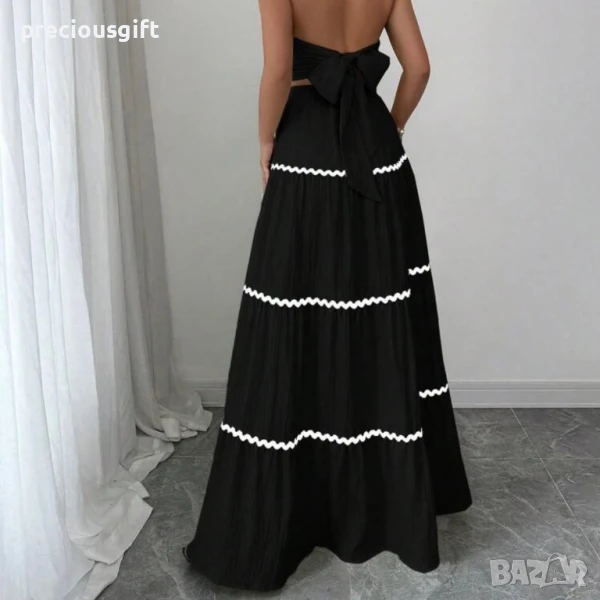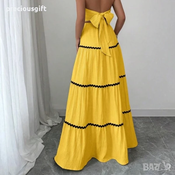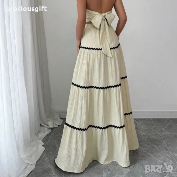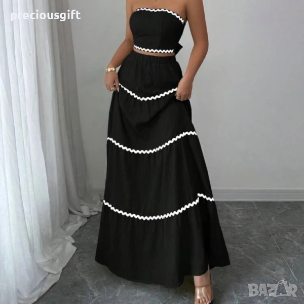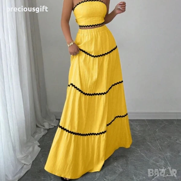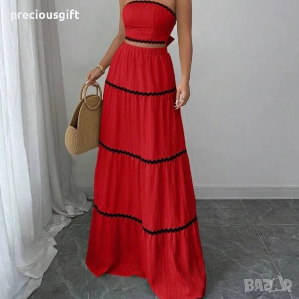 Дамски комплект - дълга пола и топ без презрамки, наличен в бежово, черено, червено, синьо, жълто